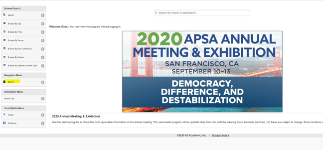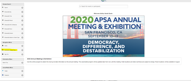 Sign in using your APSA credentials (the same you use for logging into the APSA website and  the All Academic submission site), and the click “Submission System Menu” on the left-hand side: