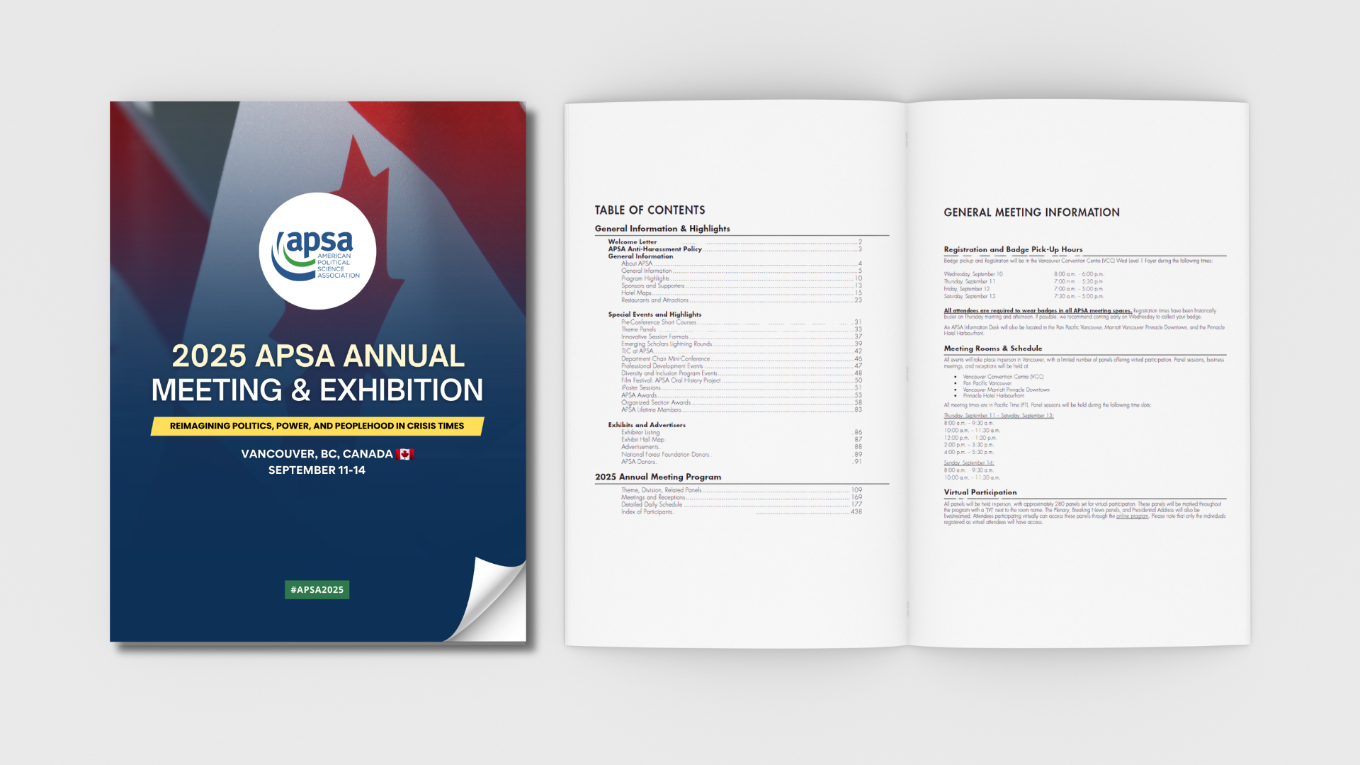 Download the APSA Annual Meeting mobile app, login to the online program, or download the digital PDF program to view panels, sessions, and events for the 2025 APSA Annual Meeting, held in Vancouver, Canada.