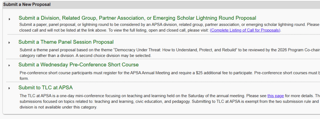 Choose “Submit a Division, Related Group, Partner Association, or Emerging Scholar Lightning Round Proposal” to submit a paper, panel, or lightning round proposal for consideration by an APSA division, related group, partner association, or the Emerging Scholar Lightning Rounds.