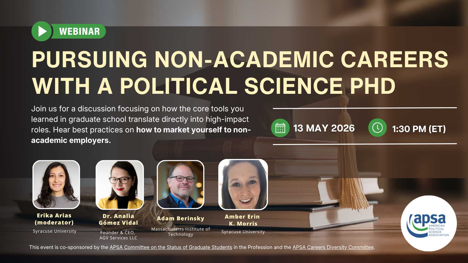 This event is co-sponsored by the APSA Committee on the Status of Graduate Students in the Profession and the APSA Careers Diversity Committee.