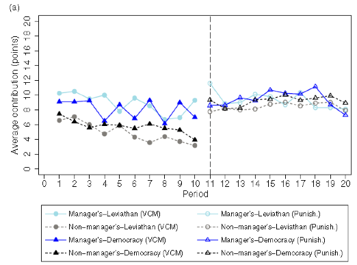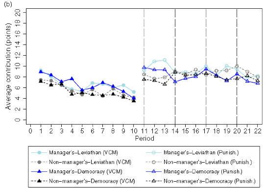 Contrary to the common belief about the influence of democratic institutions on economic outcomes, empirical evidence on delegated enforcement remains inconclusive. Some research finds that democratically appointed “third party” leaders increase public good contributions relative to randomly appointed outside agents (Baldassarri and Grossman, 2011; Grossman and Baldassarri, 2012). Others find no significant differences in group behavior in social dilemmas (Castillo et al., 2020; Hargreaves Heap, Tsutsui and Zizzo, 2020). Beyond known experimental nuances, the source of legitimacy in democratic institutional arrangements remains a challenge for causal inference.